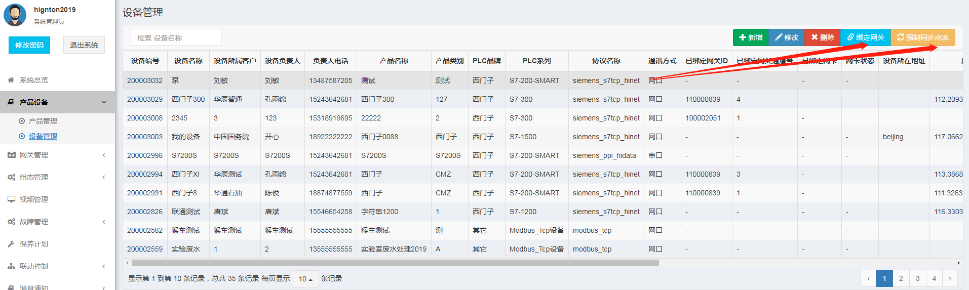 1. 点表中PLC的IP是否正确,以思普云平台采集数据为例,思普云平台的“产品设备”——“ 设备管理”处,选择设备点击【绑定网关】,设备IP填PLC的IP,再强制同步点表。
