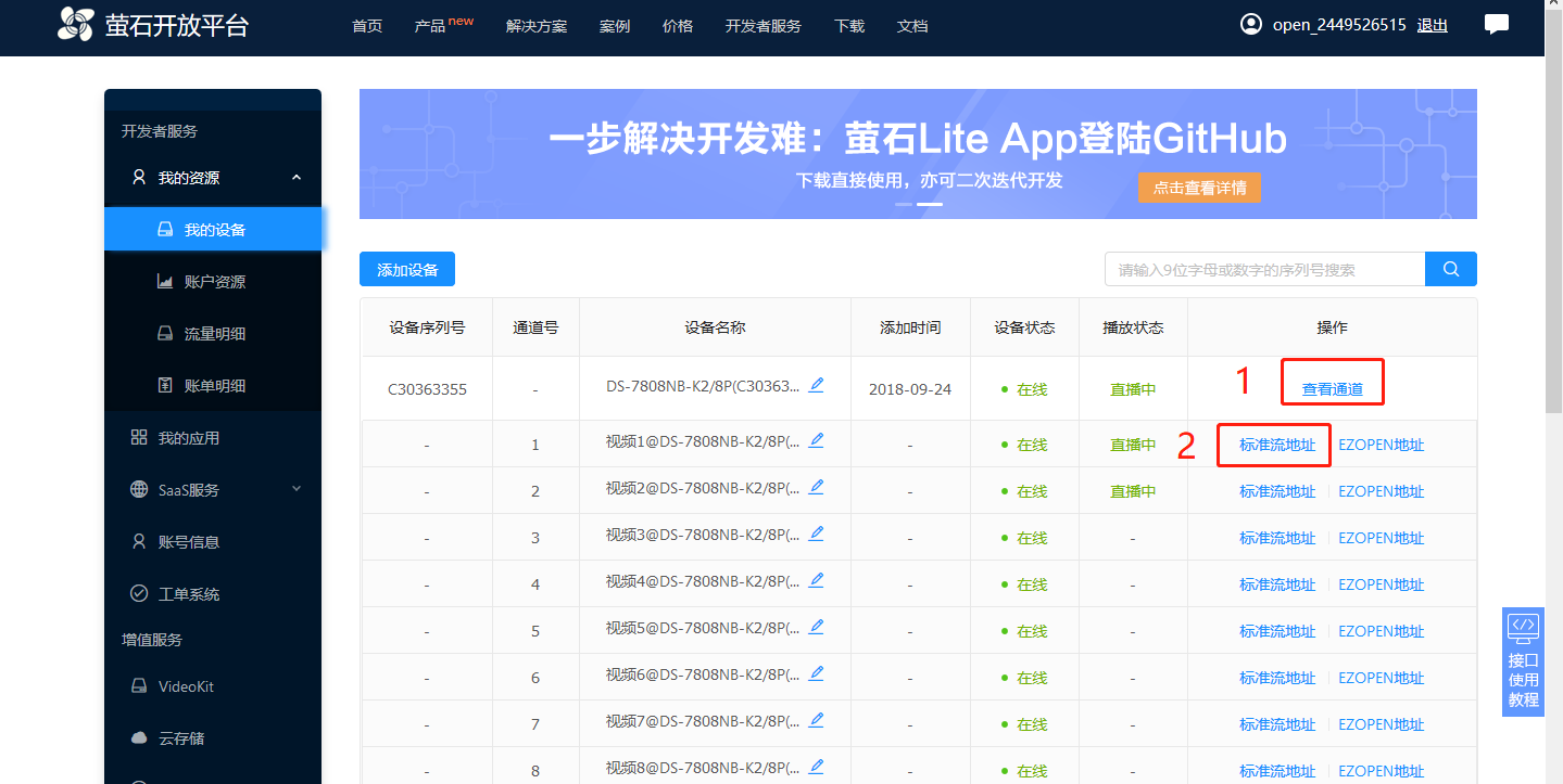 进入萤石云平台点击【查看通道】,点击【标准流地址】,